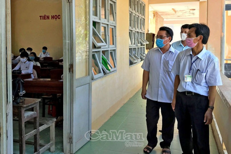 Lãnh đạo UBND huyện Năm Căn kiểm tra công tác phòng, chống dịch Covid-19 tại Trường THPT Phan Ngọc Hiển trong ngày đầu học sinh đi học trở lại. |