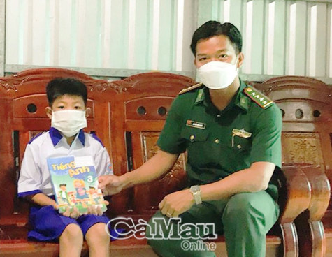 Đại úy Nguyễn Văn Quơn, Chính trị viên Đồn Biên phòng Khánh Tiến (huyện U Minh) thăm, tặng sách vở, đồ dùng học tập cho cháu Võ Thanh Văn chuẩn bị vào năm học mới.