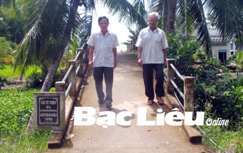 Ông Trần Văn Tèo (bên phải) đi trên cây cầu do ông vận động kinh phí xây dựng. Ảnh: N.Q