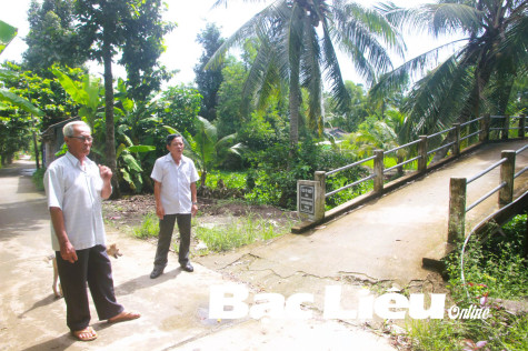 Ông Trần Văn Tèo (bên trái) đứng trước cây cầu ở ấp Mỹ Trinh (xã Hưng Phú, huyện Phước Long) do ông vận động kinh phí xây dựng. Ảnh: N.Q