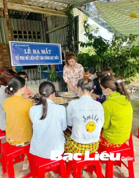 Tổ phụ nữ liên kết gia công hạt điều của Hội LHPN xã Vĩnh Thanh giúp hội viên có thu nhập ổn định. Ảnh: T.Q