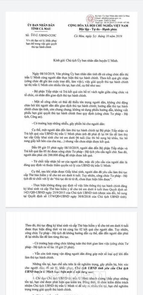 Trước đó, Văn phòng UBND tỉnh Cà Mau đã cử công chức đến thị trấn U Minh cùng người dân thực hiện thủ tục hành chính. Qua đó phát hiện một số cán bộ công chức có thái độ thiếu tôn trọng người dân khi người dân đến giao dịch thủ tục hành chính; hướng dẫn thủ tục hành chính chưa tận tình; có trường hợp nhũng nhiễu, gây phiền hà cho người dân.