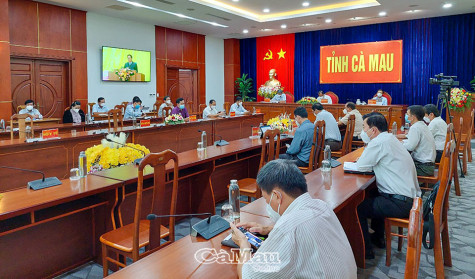 | Phó chủ tịch UBND tỉnh Nguyễn Minh Luân, Phó chủ tịch HĐND tỉnh Dương Huỳnh Khải và lãnh đạo Sở Y tế đồng chủ trì hội nghị tại điểm cầu Cà Mau. |