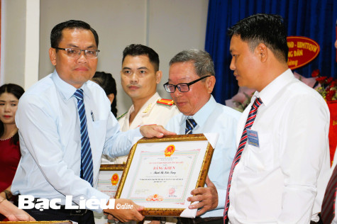 Ông Ngô Vũ Thăng - Phó Chủ tịch UBND tỉnh trao bằng khen cho các tập thể, cá nhân tại Đại hội đại biểu các dân tộc thiểu số huyện Hòa Bình lần thứ IV. Ảnh: N.Q