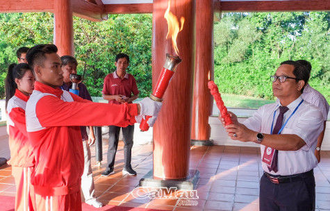 | Lửa thiêng thắp sáng ngọn đuốc Đại hội được lấy từ Đền thờ Chủ tịch Hồ Chí Minh, toạ lạc tại Phường 1, TP. Cà Mau và được các vận động viên tiêu biểu của thể thao Cà Mau đưa vào lễ đài. Ảnh: Khánh Phương - Mã Phi |