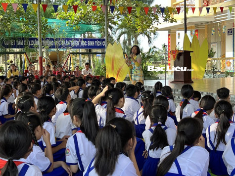 (BL-CK) Sáng 7/10, tại Trường tiểu học Đông Hải (xã Vĩnh Hậu A, huyện Hòa Bình), nhà văn Nguyễn Phan Quế Mai - nhà tài trợ kiêm đại sứ toàn cầu của Tổ chức Room to Read đã có buổi giao lưu với các em học sinh của đơn vị trong tiết chào cờ đầu tuần.