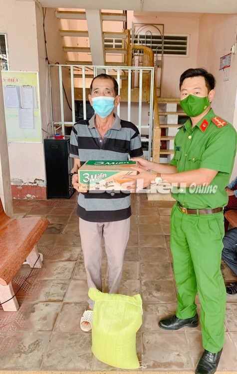 Đại úy Nguyễn Hữu Phúc trao quà cho người dân bị ảnh hưởng dịch bệnh COVID-19. Ảnh: H.L