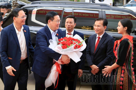 Đồng chí Vương Đình Huệ, Ủy viên Bộ Chính trị, Chủ tịch Quốc hội nhận bó hoa tươi thắm từ người dân Đắk Nông