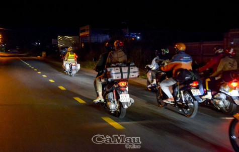 | Cảnh sát giao thông Cà Mau dẫn đoàn đưa người dân về quê một cách trật tự. Ảnh: Lê Tuấn. |