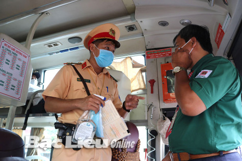 Cảnh sát giao thông nhắc nhở tài xế và hành khách thực hiện các biện pháp phòng chống dịch COVID-19. Ảnh: T.H