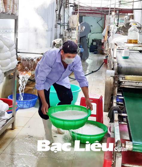 Đơn cử như tại một cơ sở sản xuất bánh hỏi - hủ tiếu trên địa bàn Phường 1 (TP. Bạc Liêu), tuy cơ sở đã đầu tư trang bị máy móc hiện đại phục vụ cho sản xuất, thế nhưng khâu chế biến vẫn còn hời hợt, không đảm bảo ATTP như: sản phẩm bánh lọt, hủ tiếu đựng trong rổ được để trực tiếp xuống nền gạch đầy nước, thay vì đặt trên kệ, trên bàn; nhân công không trang bị bao tay mà dùng tay trần tiếp xúc trực tiếp với sản phẩm…