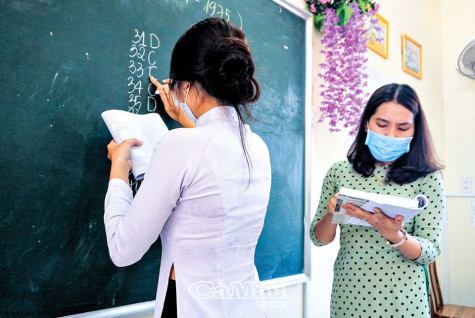Giáo viên ra đề và cho kiểm tra, giải đề trên lớp. (Ảnh chụp tại Trường THCS&THPT Lý Văn Lâm, TP Cà Mau). |