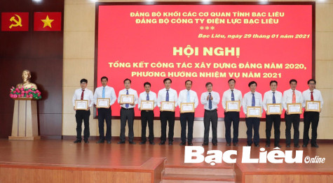 Khen thưởng cho các cá nhân có thành tích xuất sắc trong công tác xây dựng Đảng bộ Công ty Điện lực Bạc Liêu. Ảnh: Võ Trung Nhân