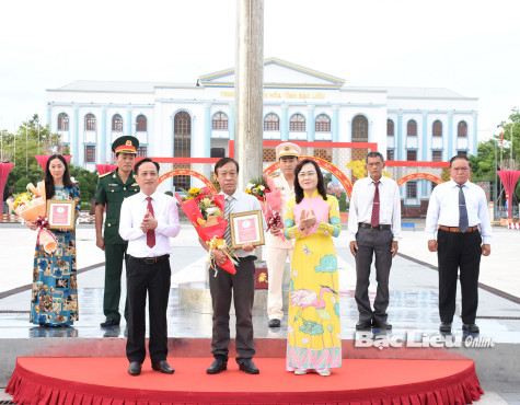 Ban Thường vụ Tỉnh ủy tuyên dương bác sĩ Đinh Xuân Phước (giữa) về thành tích học tập và làm theo Bác tại lễ chào cờ tháng 5/2022. Ảnh: H.L