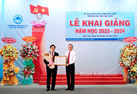 Bí thư Tỉnh ủy - Lữ Văn Hùng (bên phải) trao bằng khen của UBND tỉnh cho Trường đại học Bạc Liêu vì đã hoàn thành xuất sắc nhiệm vụ năm học 2022 - 2023.