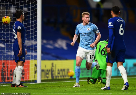 Chưa dừng lại ở đó, trước khi hiệp 1 khép lại ở phút 34. Cũng xuất phát từ pha lên bóng với tốc độ cao. Dù cú sút của Sterling đã làm thủ thành Mendy bó tay, nhưng bóng tìm đúng cột dọc bật ra. Mặc dù vậy, trên đà băng lên, Kevin De Bruyne cũng kịp ra chân, ghi bằng giúp đội khách tạm dẫn 3 – 0 sau 45 phút bóng lăn.