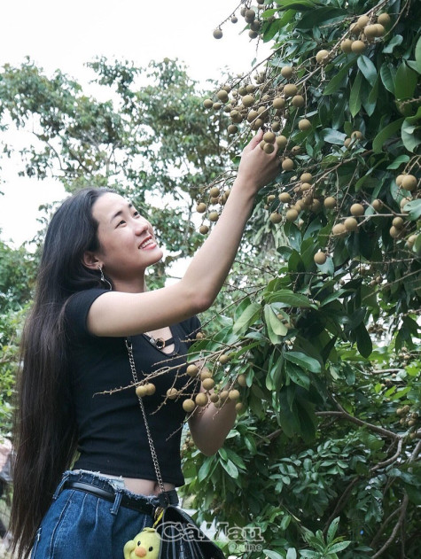 | Du khách thích thú tham quan vườn nhãn trĩu ngọt của ông Mười Sử. Ảnh: KHÁNH PHƯƠNG |