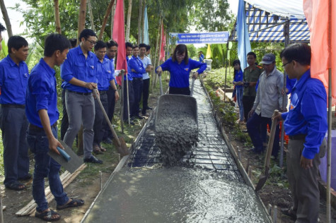 | Các bạn đoàn viên, thanh niên đóng góp ngày công lao động để đẩy nhanh tiến độ xây dựng lộ bê-tông. |