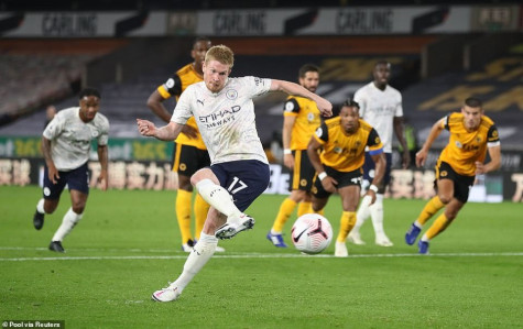 Dù phải làm khách, nhưng Man xanh mới là đội nhập cuộc tốt hơn. Bên kia chiến tuyến, Wolves chủ động đá phòng ngự phản công quen thuộc. Tuy vậy, trước hàng thủ được bố trí kín kẻ, nhưng Man City vẫn biết cách gây áp lực và sớm có bàn thắng. Ngay phút 20, Kevin De Bruyne bị phạm lỗi trong khu vực 16m50. Đứng trước cơ hội không thể tốt hơn, chính cầu thủ người Bỉ tự tin ghi bàn, mở tỷ số trận đấu.