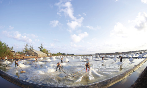 Diêm dân huyện Đông Hải thu hoạch muối trải bạt. Ảnh: T.L
