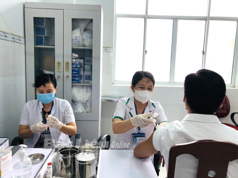 Trung tâm Kiểm soát bệnh tật tỉnh tiêm vắc-xin phòng COVID-19 cho đối tượng cán bộ, công chức, viên chức. Ảnh: N.Q