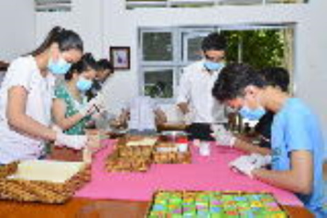 Các học sinh khiếm thính đang thực hiện công đoạn đóng gói bánh xà phòng tại lớp học. |