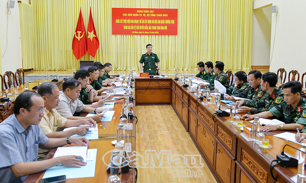 Tại buổi làm việc, Bộ CHQS tỉnh báo cáo tiến độ triển khai Đề án. Đến nay, Cà Mau đã cơ bản hoàn thành các hạng mục chính của giai đoạn 2, gồm: quy hoạch khu đất xây dựng trụ sở, bến neo đậu phương tiện, khu hậu cần kỹ thuật, nơi ăn ở, sinh hoạt cho cán bộ, chiến sĩ. Công tác tổ chức lực lượng, huấn luyện và trang bị phương tiện được triển khai theo đúng quy định, bảo đảm chất lượng, hiệu quả, sát thực tiễn nhiệm vụ trên địa bàn.