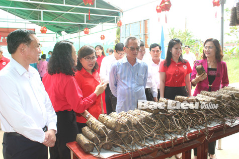 Lãnh đạo Hội Chữ thập đỏ Việt Nam cùng lãnh đạo Tỉnh ủy, UBND tỉnh Bạc Liêu tham quan các gian hàng “Tết Nhân ái” tổ chức tại xã Hưng Hội (huyện Vĩnh Lợi).
