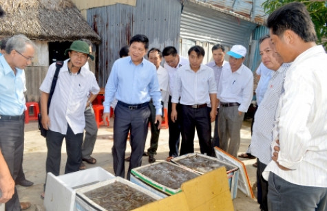 | Ông Lê Văn Sử, Phó Chủ tịch UBND tỉnh cùng đoàn cán bộ Sở NN&PTNT tỉnh khảo sát mô hình tôm - lúa trong liên kết chuỗi giá trị tại huyện Thới Bình. Ảnh: NGỌC HUỆ |