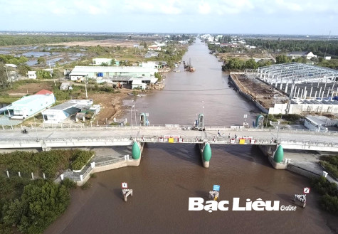 Công trình cống Cái Cùng (xã Vĩnh Thịnh, huyện Hòa Bình) giúp điều tiết nước mặn phục vụ nhu cầu nuôi tôm của người dân vùng Nam Quốc lộ 1A.