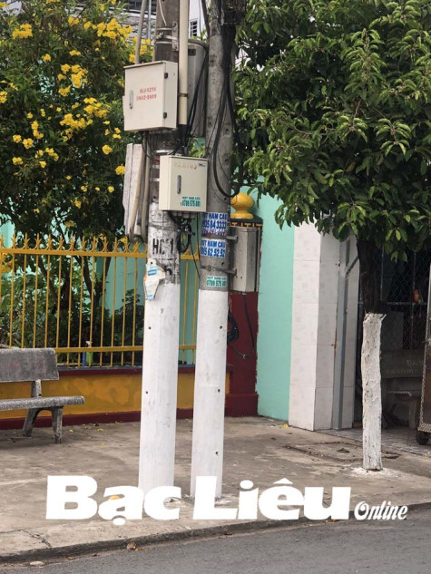 Một cột điện bị dán, vẽ sơn sản phẩm quảng cáo tại Phường 1 (TP. Bạc Liêu). Ảnh: K.K