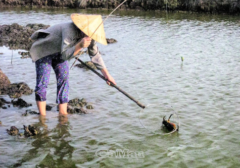 | Cua mê ăn, càng kẹp chặt miếng mồi, một tay từ từ kéo nhẹ cần câu, vừa thấy càng cua gần mặt nước, dùng vợt xúc thật nhanh, con cua bị tóm gọn. Ảnh: THANH CHI |