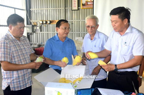 Phó Chủ tịch Thường trực UBND tỉnh - Lê Tấn Cận xem sản phẩm xoài đặc sản của Đồng Tâm Hội quán (xã Tịnh Thới, TP. Cao Lãnh, tỉnh Đồng Tháp).