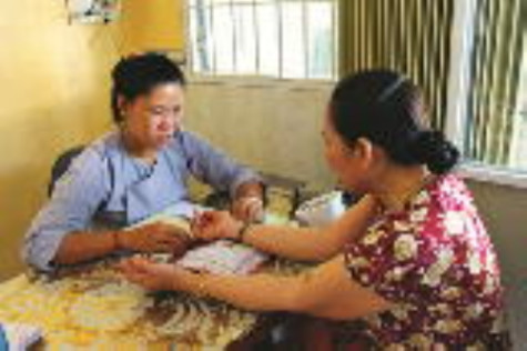 | Lương y Lê Thị Vân ân cần bắt mạch và khám bệnh cho bệnh nhân. |