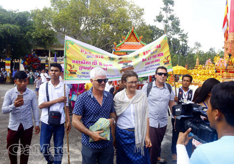 Du khách nước ngoài thích thú tham gia lễ dâng y Kathina tại chùa Soryaram.