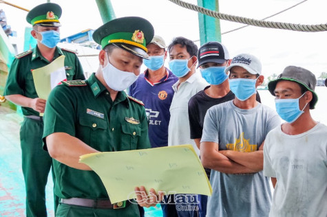 | Bộ đội Trạm Kiểm soát biên phòng Sông Ðốc phát tờ rơi tuyên truyền pháp luật cho ngư dân. (Ảnh chụp ngày 4/2/2021). |