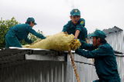 | Ban chỉ huy quân sự xã giúp người dân chằng chống nhà cửa khi bão sắp đến |