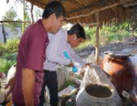 | Nhân viên y tế xã kiểm tra việc nuôi cá bảy màu tại hộ ông Võ Văn Lợi, Ấp 18, xã Nguyễn Phích. |