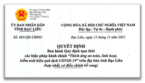 UBND tỉnh vừa ban hành Quyết định điều chỉnh, bổ sung Quy định tạm thời các biện pháp hành chính “Thích ứng an toàn, linh hoạt, kiểm soát hiệu quả dịch COVID-19”. Quy định có hiệu lực từ 0 giờ ngày 16/11/2021. Đây là văn bản hợp nhất quy định về thực hiện Nghị quyết 128 (có sửa đổi bổ sung), tích hợp các văn bản đã ban hành trước đây, giúp người dân không phải tra cứu ở nhiều văn bản khác nhau. Đặc biệt, trong Quyết định đã pháp lý hóa quy trình truy vết F1 theo đề xuất của Bệnh viện Chợ Rẫy. Báo Bạc Liêu xin giới thiệu toàn văn Quyết định này.