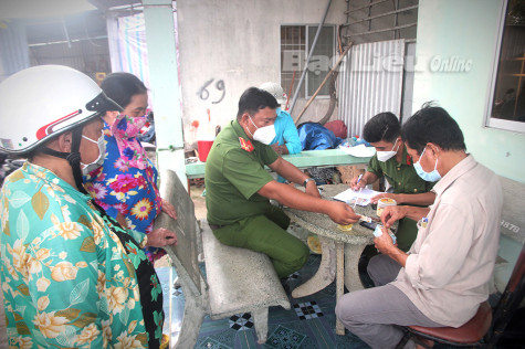 Đồng chí Lâm Kim Hái - Bí thư Chi bộ, Trưởng khóm 6 (bìa phải) cùng Công an Phường 2 (TP. Bạc Liêu) phát căn cước công dân chiều 3/12/2021. Ảnh: N.Q