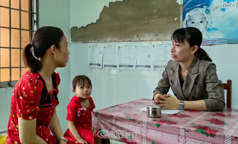 | Nhân viên y tế tư vấn chăm sóc dinh dưỡng cho trẻ. |