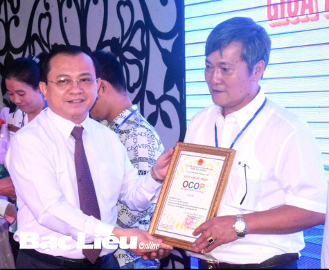 Phó Chủ tịch Thường trực UBND tỉnh - Lê Tấn Cận trao giấy chứng nhận sản phẩm OCOP cho các chủ thể.