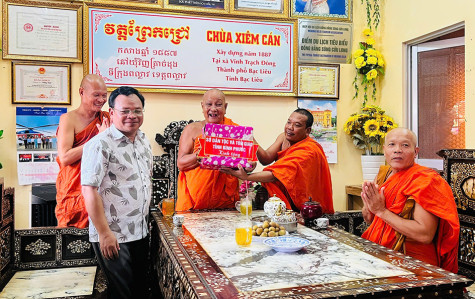 Ông Điểu Nen - Giám đốc Sở Dân tộc và Tôn giáo tỉnh Bình Phước, tặng quà cho các vị chức sắc cấp cao Phật giáo Nam tông Khmer trong chuyến tham quan chùa Xiêm Cán (TP. Bạc Liêu). Ảnh: N.Q