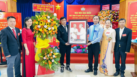Đồng chí Phạm Tuấn Tài, Phó Chủ tịch Uỷ ban MTTQ Việt Nam tỉnh, Bí thư Tỉnh đoàn, trao tặng bức ảnh Bác Hồ – Bác Tôn, chúc mừng đại hội.