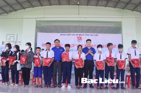 Bí thư Đoàn khối các cơ quan tỉnh - Đặng Văn Sờn và Bí thư Huyện đoàn Vĩnh Lợi - Hà Phú Quí trao quà cho học sinh có hoàn cảnh khó khăn trước thềm năm học mới. Ảnh: H.L