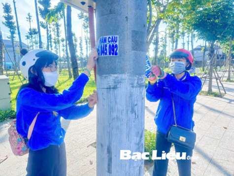 Ngày 24/10, Đoàn Phường 5 (TP. Bạc Liêu) tổ chức ra quân tháo gỡ giấy dán quảng cáo sai quy định trên trụ điện, cây xanh trên tuyến đường Cao Văn Lầu thuộc khóm 3, Phường 5 (ảnh).
