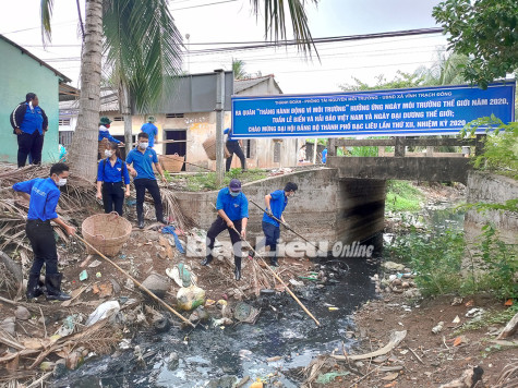 ĐV-TN thành phố ra quân làm vệ sinh môi trường ở xã Vĩnh Trạch Đông (TP. Bạc Liêu). Ảnh: H.H.N