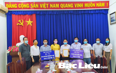 Công ty Hoàng Lộc và Công ty Bông Gạo Vàng trao bảng tượng trưng tặng 10 triệu con tôm giống và 50kg men vi sinh Enzyme phục vụ nuôi tôm cho Sở NN&PTNT để phân phối về các địa phương. Ảnh: C.L