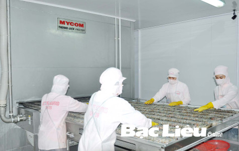 Chế biến tôm xuất khẩu tại Công ty Âu Vững (TX. Giá Rai). Ảnh: K.T