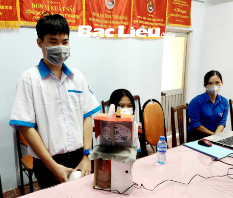 Thí sinh thuộc Đoàn trường THPT Hiệp Thành trình bày sản phẩm “Máy rửa tay tự động” được làm từ bìa cứng và thiết bị cảm biến phun xịt khuẩn. Ảnh: Thành đoàn TP. Bạc Liêu